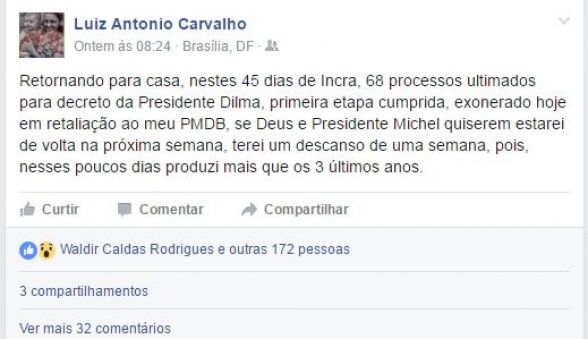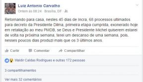 “Retornando para casa, nestes 45 dias de Incra, 68 processos ultimados para decreto da Presidente Dilma, primeira etapa cumprida, exonerado hoje em retaliação ao meu PMDB, se Deus e Presidente Michel quiserem estarei de volta na próxima semana, terei um descanso de uma semana, pois, nesses poucos dias produzi mais que os 3 últimos anos”, postou o ex-secretário.