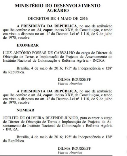 Dessa forma, o então diretor de Obtenção de Terras do Incra, Marcelo Afonso Silva, que estava no Incra desde 2011 por indicação da senadora Gleisi Hoffmann, foi exonerado do cargo para dar lugar a Luiz Antônio Possas de Carvalho, aliado de Carlos Bezerra. “Bezerra é um dos deputados do PMDB que tem se manifestado contra o impeachment de Dilma. Advogado por formação, ele argumenta não ver sustentação jurídica para o afastamento da presidente”, dizia a publicação.