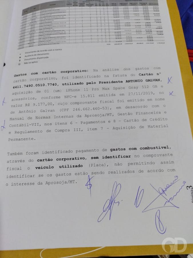 Em uma das irregularidades, foi identificado na fatura do cartão corporativo da entidade, que Antônio Galvan comprou um Iphone 11 Pró Max Space Gray 512 GB por R$ 9.177 mil em seu próprio CPF. Ou seja, utilizou recursos da entidade para obter um bem em seu nome.