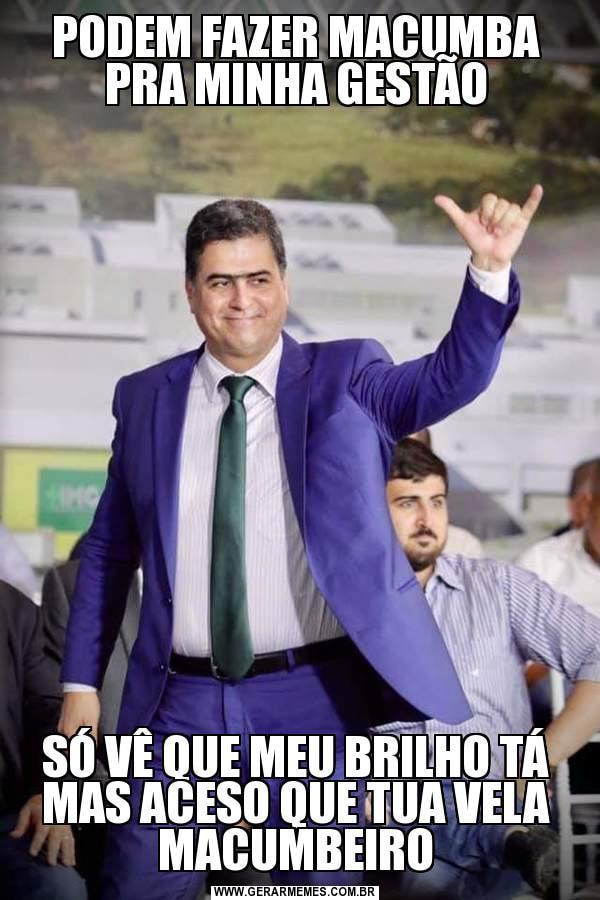 Nem o governador Mauro Mendes (DEM) escapou das piadas, por causa da rixa com o prefeito. Em um dos posts que utiliza a foto de Mendes foi escrita a frase "Eu não tenho medo de macumba, já sou abençoado".