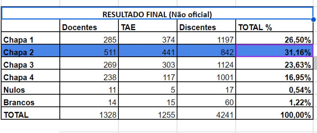 Já a chapa 4, encabeçada pela professora de Física, Iramaia Jorge, e do professor de Engenharia Civil, Alex Neves Junior, recebeu 16,95% votos.