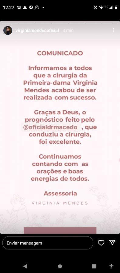 A primeira-dama Virginia Mendes já passou pela cirurgia de retirada de um tumor do pâncreas na manhã desta segunda-feira (13), em São Paulo. De acordo com a assessoria de imprensa, o procedimento foi um 'sucesso'. O comunicado foi divulgado pelas redes sociais de Vírginia, onde o prognóstico do cirurgião Antônio Luiz Macedo é que todo o processo cirúrgico foi 'excelente'.