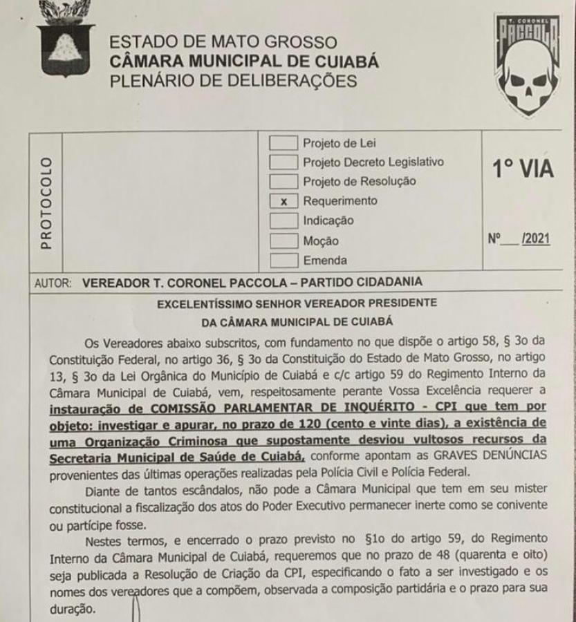 A bancada de oposição ao prefeito Emanuel Pinheiro (MDB) se movimenta para tentar instalar mais uma Comissão Parlamentar de Inquérito (CPI) com intuito de investigar supostos desvios de recursos da Secretaria Municipal de Saúde (SMS), pasta que conta com R$ 1,4 bilhão de orçamento só para 2021. A proposta foi apresentada pelo vereador tenente-coronel Paccola (Cidadania) e já conta com a assinatura de 4 parlamentares.