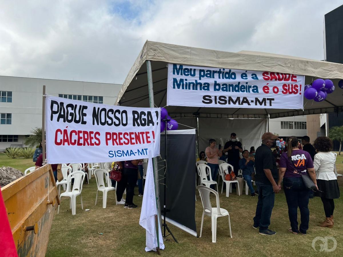 Servidores públicos do Poder Executivo protestam na Assembleia Legislativa para pressionar o governo Mauro Mendes (União) a conceder a Revisão Geral Anual (Anual).