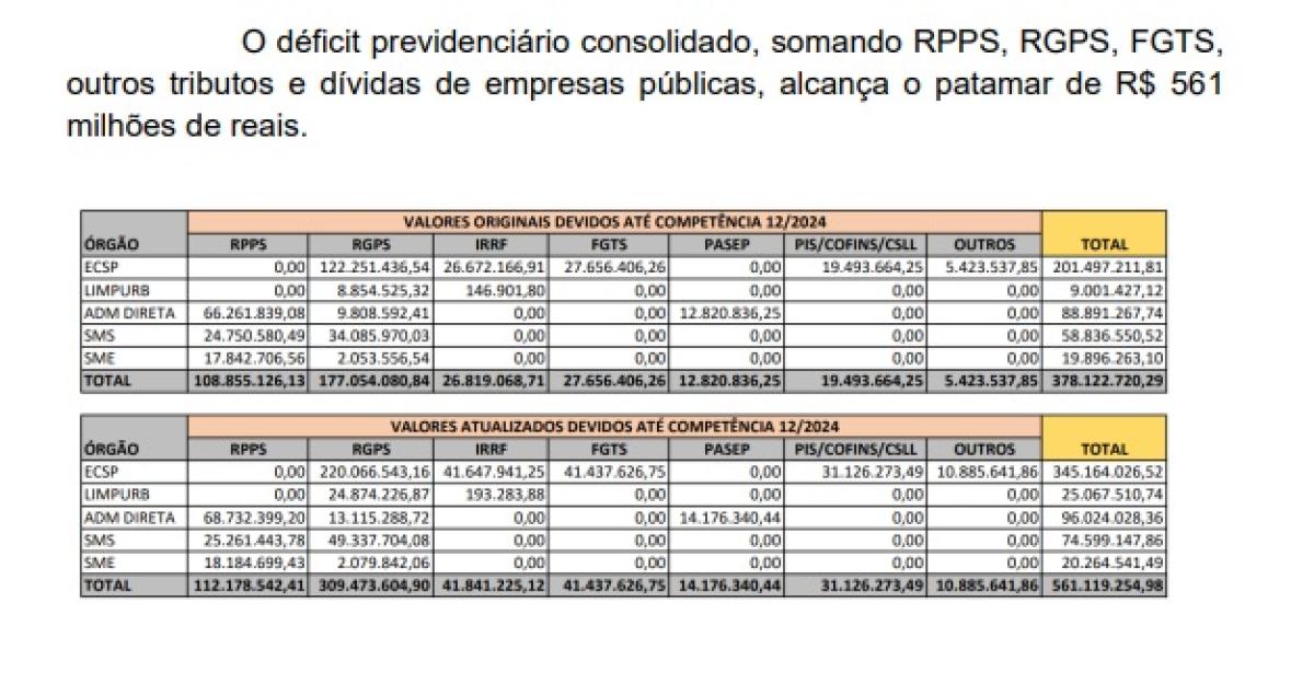 O relatório aponta que a soma atualizada dos débitos ultrapassa R$ 561 milhões, considerando dívidas previdenciárias, FGTS, PIS/Cofins, IRRF, PASEP e outros tributos não recolhidos. "A CPI conclui que o déficit previdenciário não foi fruto de falha técnica ou burocrática, mas sim de decisões conscientes, contrárias à lei, que prejudicaram", cita.