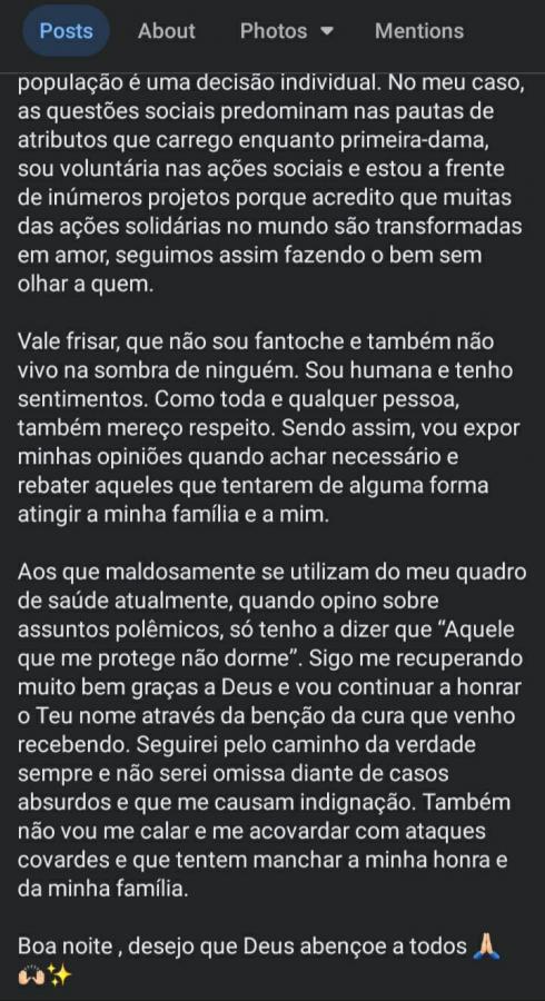 Ainda na postagem feita no início desta noite, a primeira-dama disse que segue se recuperando muito bem e finaliza dizendo, mais uma vez, dizendo que não aceitará críticas calada. “Seguirei pelo caminho da verdade sempre e não serei omissa diante de casos absurdos e que me causam indignação”.