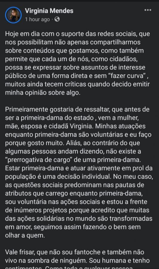 Um dia após se envolver em uma polêmica em um grupo de WhatsApp e rebater o deputado Eduardo Botelho (União), a primeira-dama Virginia Mendes voltou a se pronunciar nesta terça-feira (28), dessa vez em suas redes sociais, e afirmou que vai expor suas opiniões e rebater aqueles que tentam atingi-lá e atacam a sua família.