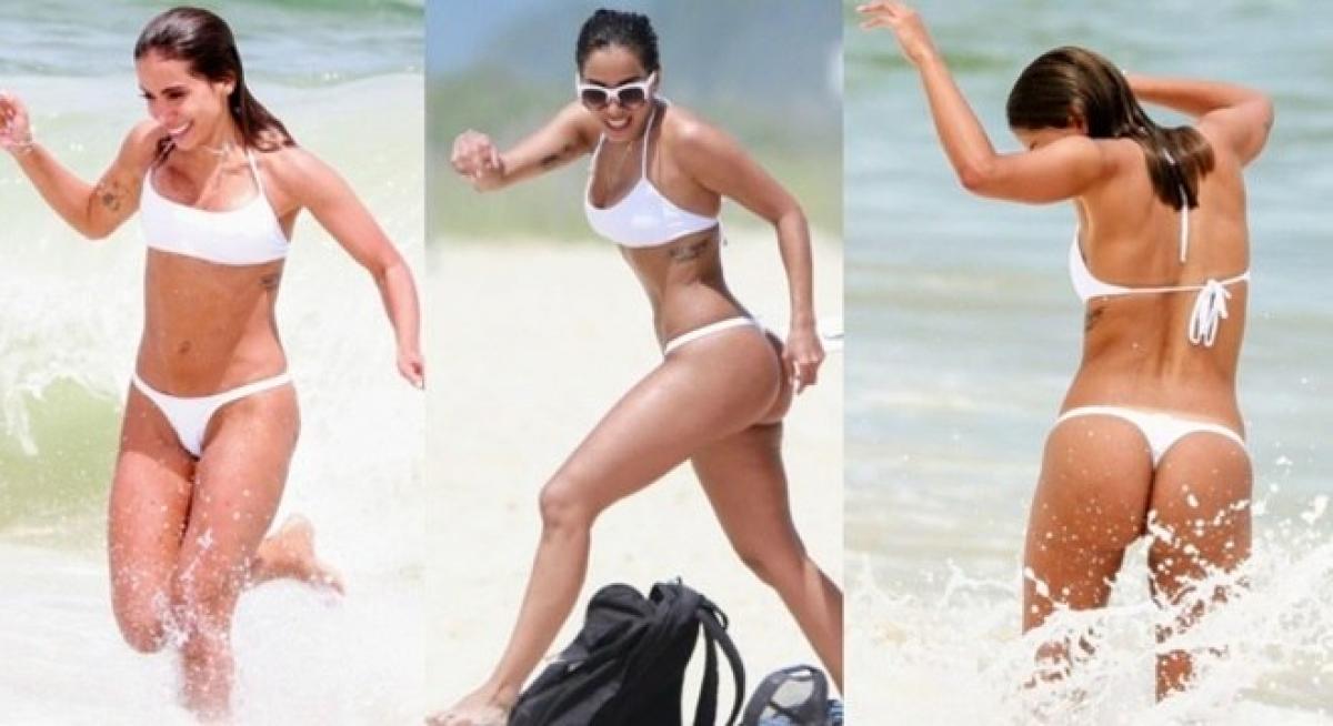 A cantora foi clicada pelos paparazzis e seu biquíni chamou à atenção. A morena apostou no biquíni reto, com top maior e calcinha mais fina na lateral, o modelo também era fio dental e a cor branca valorizou seu tom de pele bronzeado.