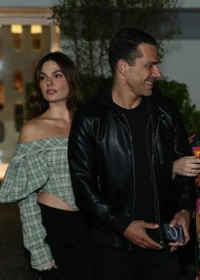 O empresário estava todo de preto, com uma jaqueta de couro. Já a atriz optou por um look composto por uma calça preta e um cropped de xadrez, com margas bufantes e um decote ombro a ombro.