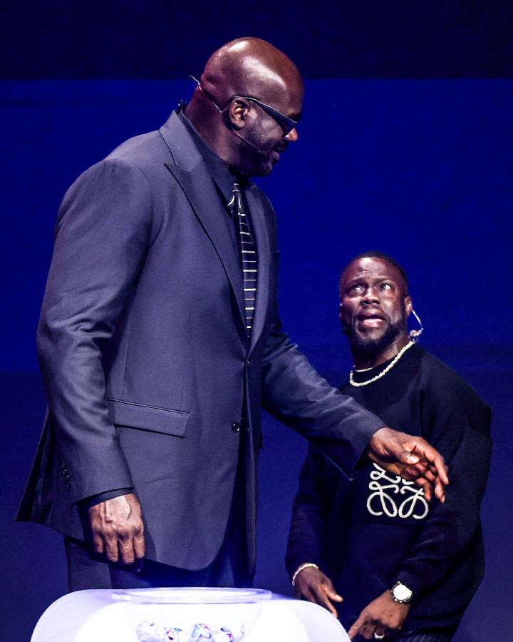 Hart, com alegados 1,65 m, foi um dos apresentadores do sorteio. O’Neal, de 2,16 m, foi escolhido para sortear os grupos. Lado a lado, a diferença de 51 centímetros fez a festa do povo na internet.