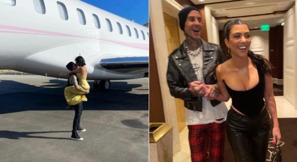 O músico agradeceu ao publicar uma foto no qual segura Kourtney no colo na frente de um jatinho: "Com você, tudo é possível".