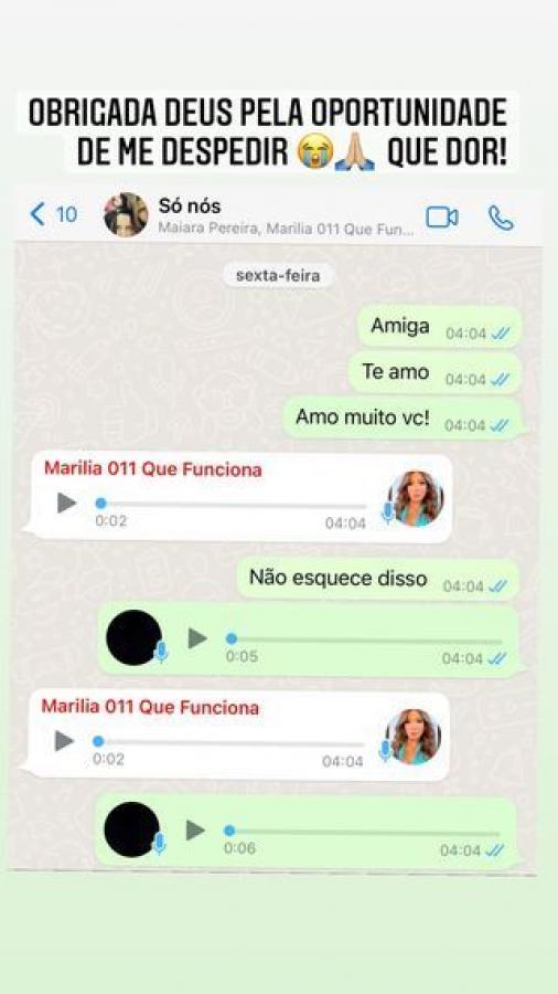 No diálogo, Maraisa diz que ama a amiga e pede a ela que nunca se esqueça disso. "Obrigada, Deus, pela oportunidade de me despedir. Que dor!", comentou a irmã de Maiara.