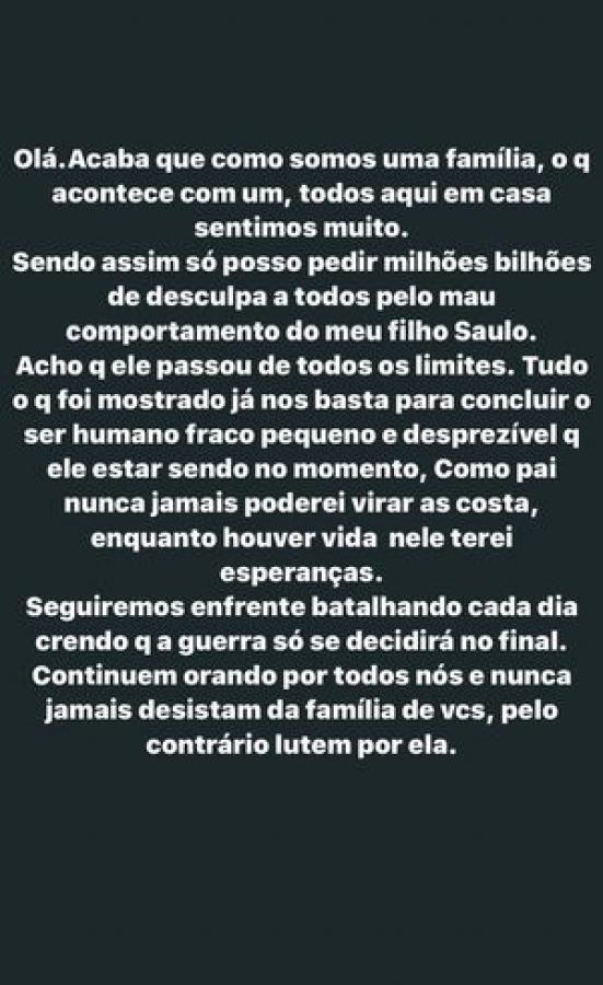 Em texto compartilhado no Instagram, o pai de Saulo criticou o comportamento do filho.