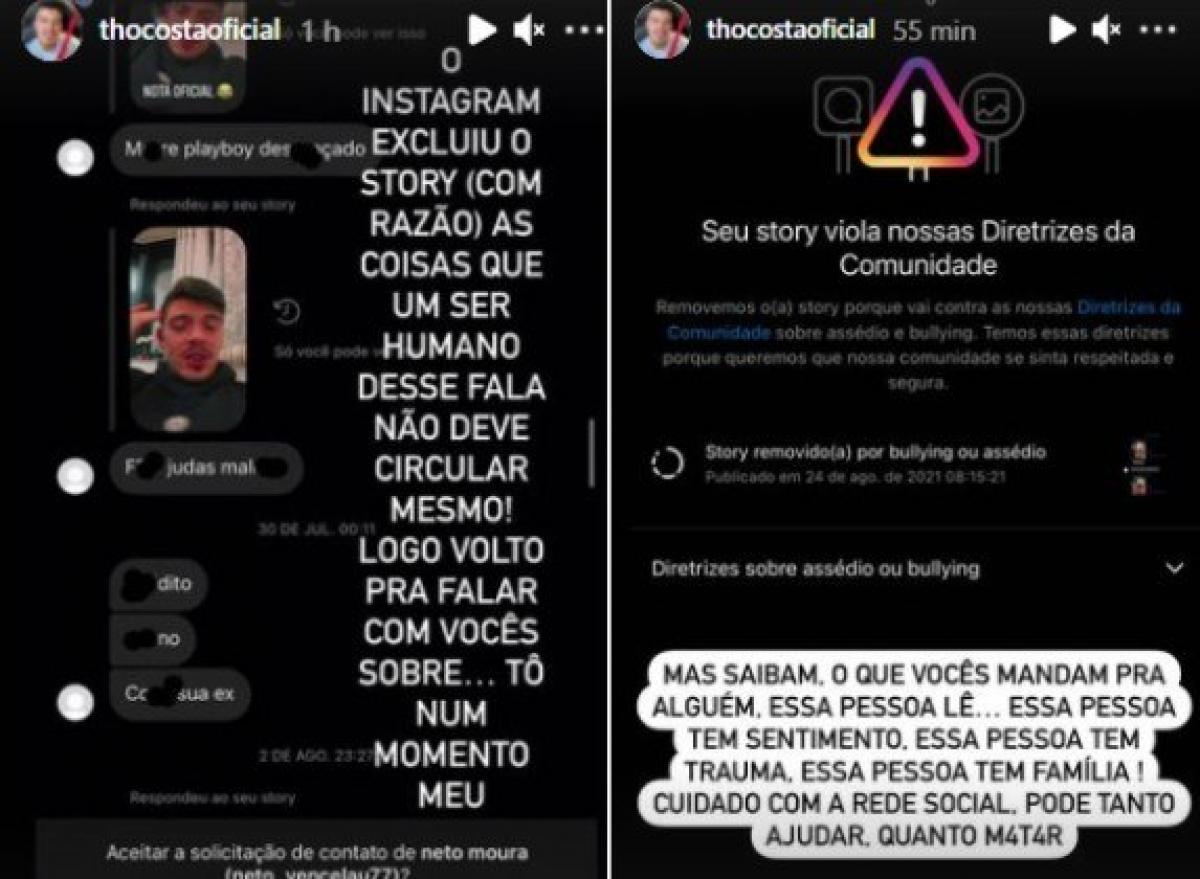 Tudo começou quando Thomaz expôs alguns prints de mensagens de ódio enviadas por haters. Devido ao teor negativo dos comentários, a plataforma excluiu as publicações feitas pelo artista, que comentou: