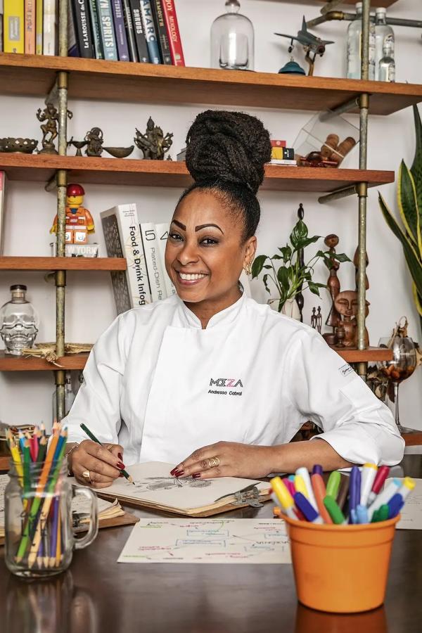 Filha de Oyá, expressa sua identidade preta nos pratos e visita sua ancestralidade para desenvolver novas perspectivas de futuro para gastronomia, praticando suas convicções e vivências em uma cozinha autoral que ela mesma denomina Pretopolita.
