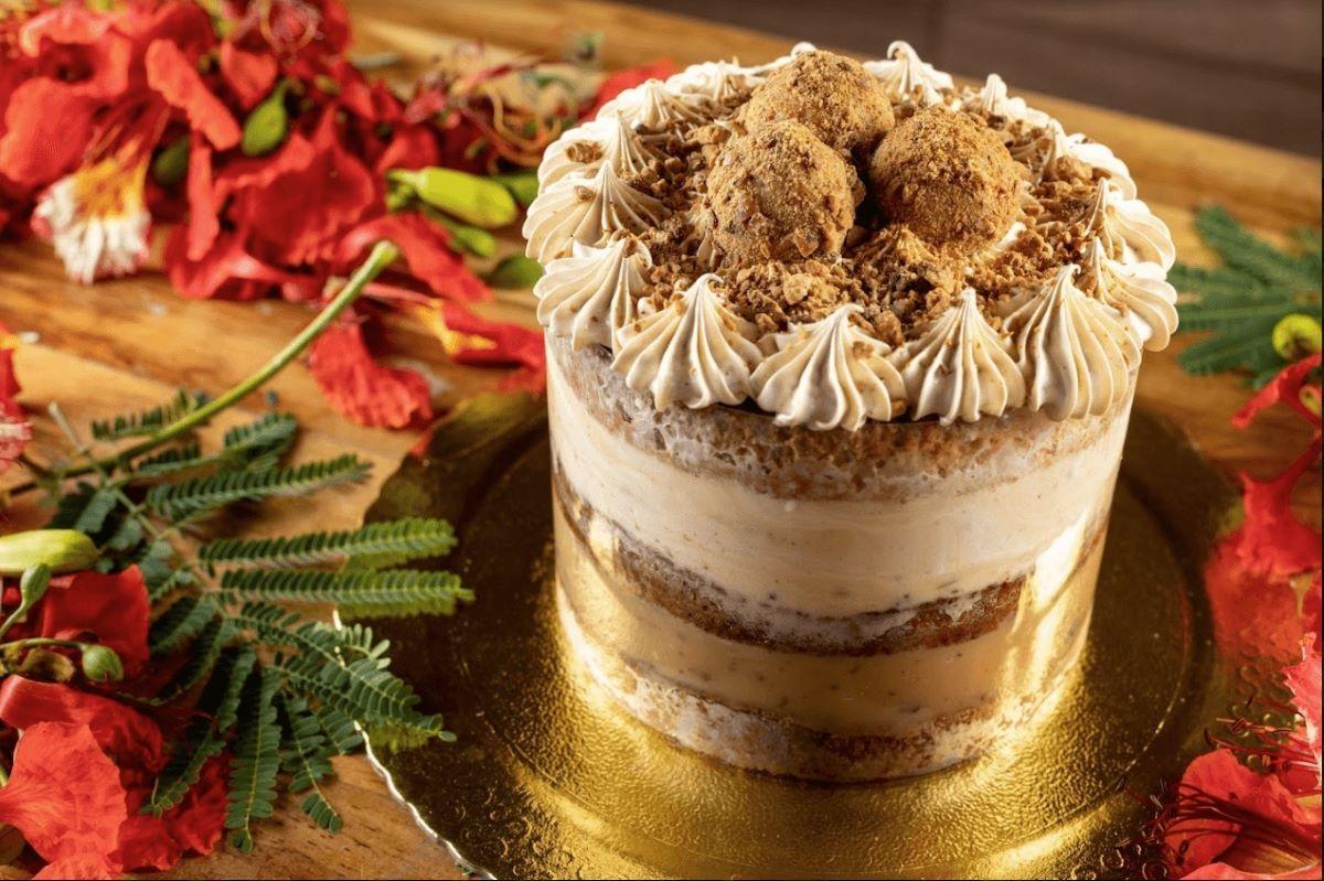 Já o caju entra com tudo no bolo com calda de brigadeiro de doce de caju, finalizado com caju cristalizado, em calda e um crumble da castanha.