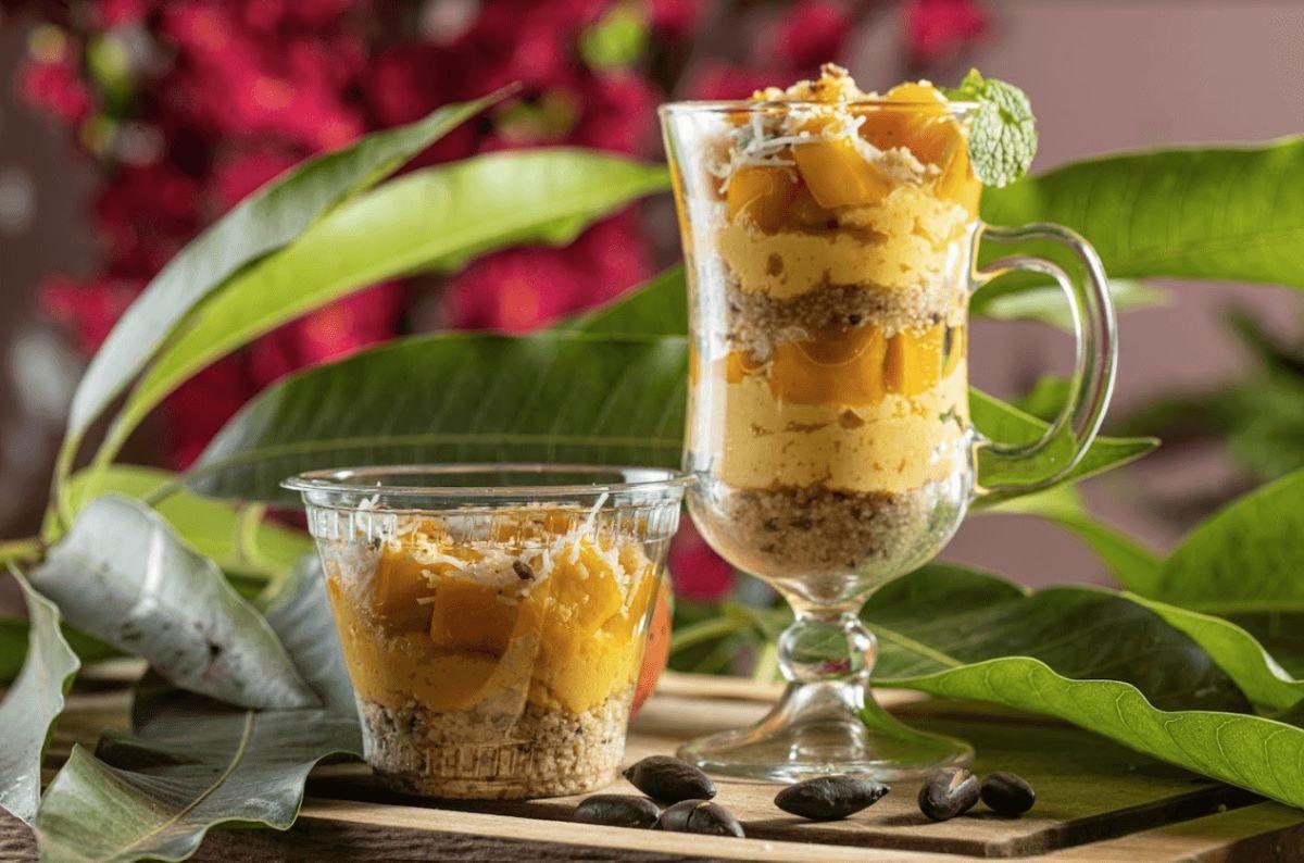 Estão na taça com creme de mousse de manga com ceviche de manga e crumble de castanha de cumbaru, numa combinação super harmônica. No ceviche combinamos o dulçor da manga com a acidez do limão. E a castanha de cumbaru trouxe a crocância descreve o chef, acrescentando que por incrível que pareça, a castanha de cumbaru, mesmo sendo pouco conhecida é bastante emblemática no Pantanal.