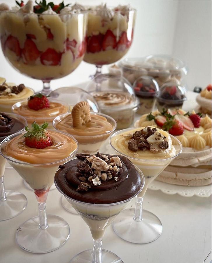 Lindas e deliciosas verrines se transformam em verdadeiros copos da felicidade com suas camadas combinando chocolate com outros ingredientes, oferecendo um sabor de pura alegria em cada mordida.
