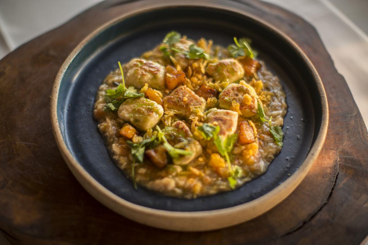 Empório Pantaneiro - Nhoque de pintado, molho de escabeche de pacu, banana frita e palha de mandioca.
