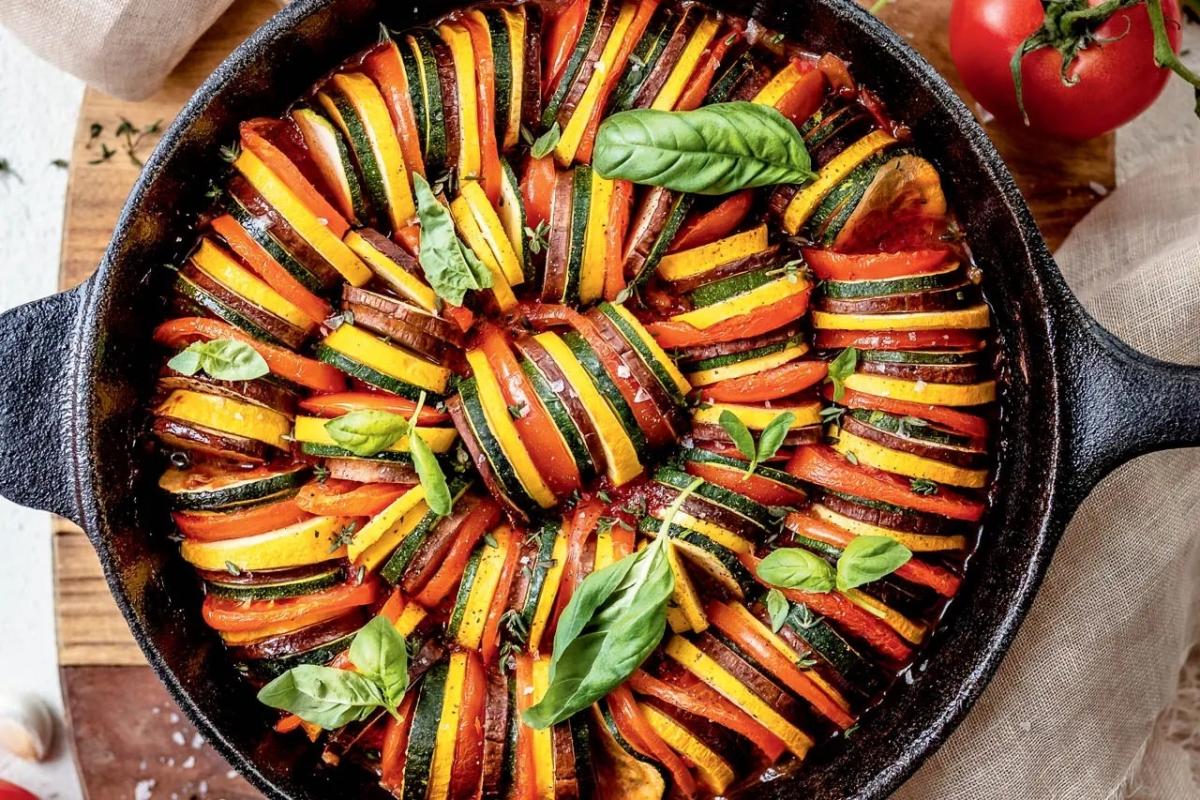 Corte os vegetais em rodelas finas sem as sementes. Cubra o fundo de uma forma com o molho de tomate. Monte tudo intercalando com os vegetais.