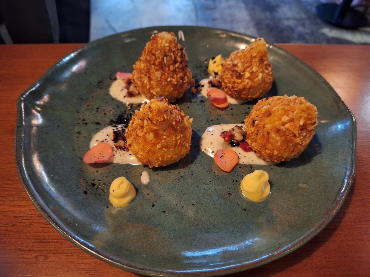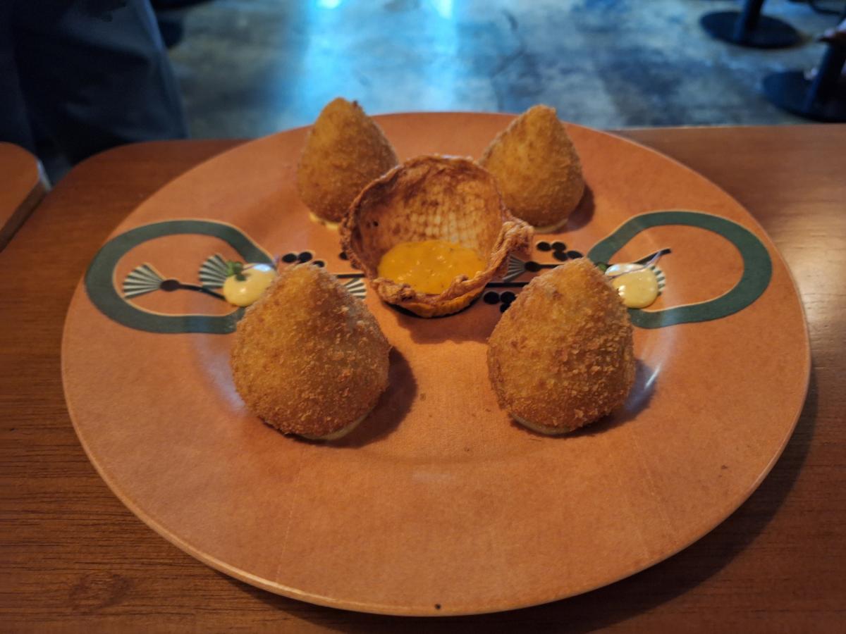 Um dos detalhes da preparação é o uso de um mandiopan, criado pelo Rômulo e utilizado em algumas entrada do Brasido, como elemento a mais na hora de empanar a coxinha, conferindo a ela uma crocância toda especial.