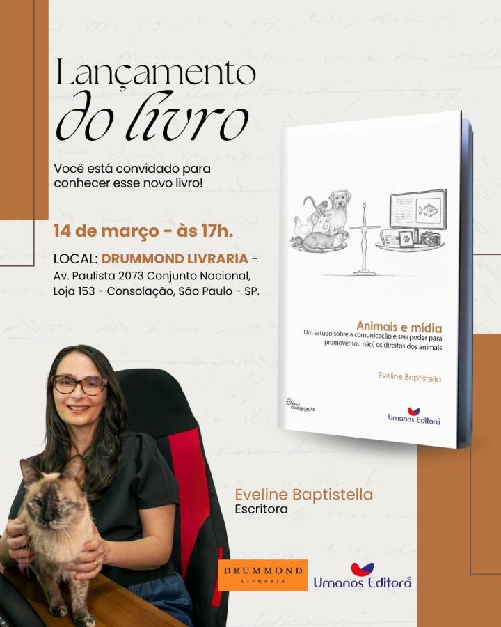 A forma como a imprensa retrata os animais pode influenciar diretamente abandono, maus-tratos ou proteção das espécies. É o que discute a jornalista e pesquisadora Eveline Baptistella em seu novo livro “Animais e Mídia: Um estudo sobre a comunicação e seu poder para promover (ou não) os direitos dos animais”. Com base em décadas de pesquisa, ela mostra como as narrativas midiáticas, especialmente na imprensa, influenciam a maneira como a sociedade enxerga as demais espécies de animais e como as trata.