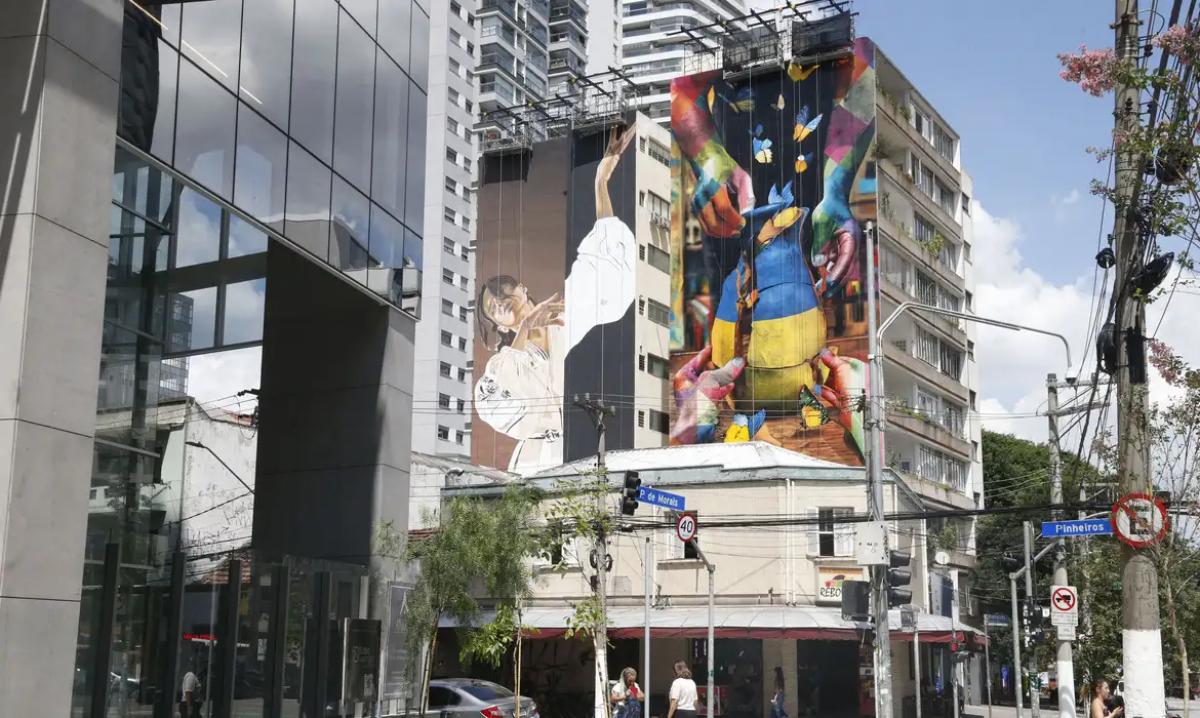 Cada uma dessas duas imagens que foram pintadas na parede de um mesmo prédio residencial localizado na Avenida Pedroso de Morais, número 144, expressa estilo e linguagens diferentes. Mas elas foram feitas por meio de um trabalho colaborativo e estão lado a lado para lembrar os dois anos da guerra entre a Ucrânia e a Rússia e defender proteção ambiental. Chamado de The Exchange (o intercâmbio, em português), o mural está sendo inaugurado hoje (5) e é uma iniciativa do Instituto Ucraniano no Brasil.