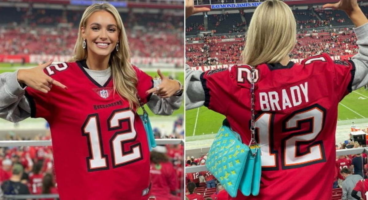 Apontada como novo affair de Tom Brady, a beldade primeiramente roubou a cena ao posar com a camisa 12, usada pelo atleta no time de futebol americano Tampa Bay Buccaneers.